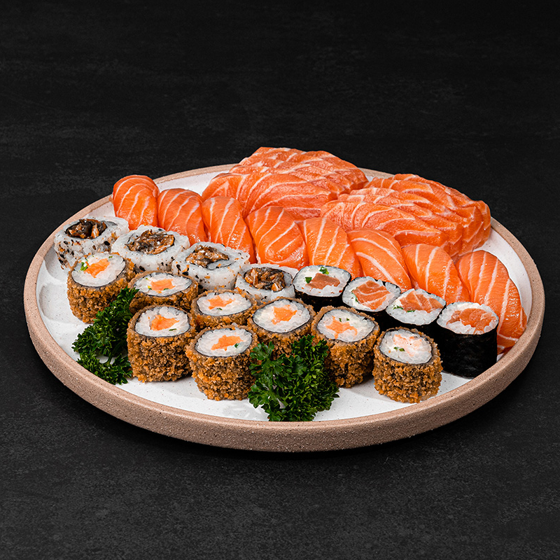 5 sashimi atum, 5 sashimi salmão,3 gunkan salmão com cream cheese, 2 sushi salmão, 2 sushi atum, 2 sushi kani, 2 sushi skin, 2 sushis camarão, 4 california e 8 hot filadélfia